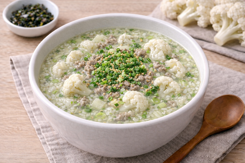 ④ 뜸 들이기: 약불에서 7분 정도 정성껏 저어주세요. 하얀 콜리플라워 입자가 쌀미음과 섞여 뽀얀 빛깔을 낼 때 불을 끄면 완성입니다.